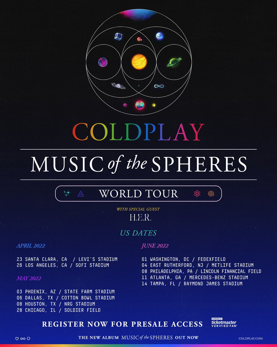 Save Up To 20 Now. Coldplay World of Spheres Tour 2022. Coldplay announced the dates for an expansive 2022 world tour in support of the groups upcoming Max Martin-produced album Music of the Spheres on Thursday morning Oct.